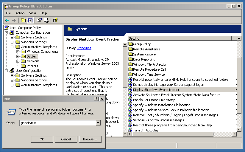 We will need to go into Group Policy Object Editor, go to Start → Run → and type gpedit.msc followed by enter. You should see the Group Policy Editor as shown on the left. Browse to Computer Configuration → Administrative Templates → System → now look in the right window pane and double click on Display Shutdown Event Tracker and disable it !!!